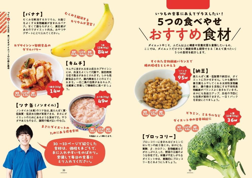 さらに、ダイエットに最適な、たくみ先生おすすめの「7つの食べやせ神食材」と、いつもの食事にあえてでもプラスしたい「5つのおすすめ食材」も紹介。