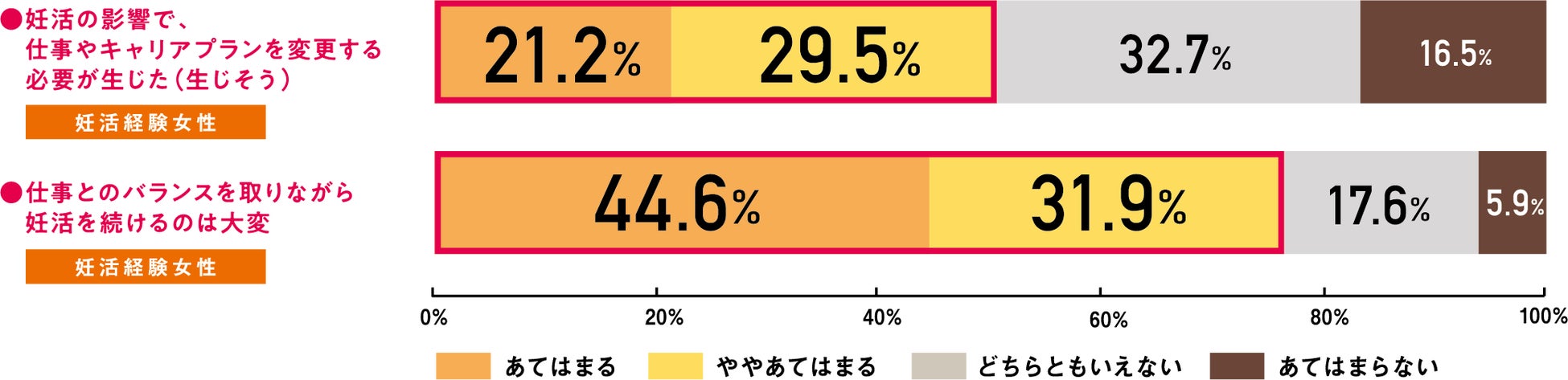 子どもを望む有職女性は一定数いる一方、妊活を経て子どもを授かった経験のある女性の50.7%は、「妊活の影響で仕事やキャリアプランを変更する必要が生じた」と答えました。また、76.5%が「仕事とのバランスを取りながら妊活を続けるのは大変」と、キャリアと妊活の両立に苦戦しているのも現状です。