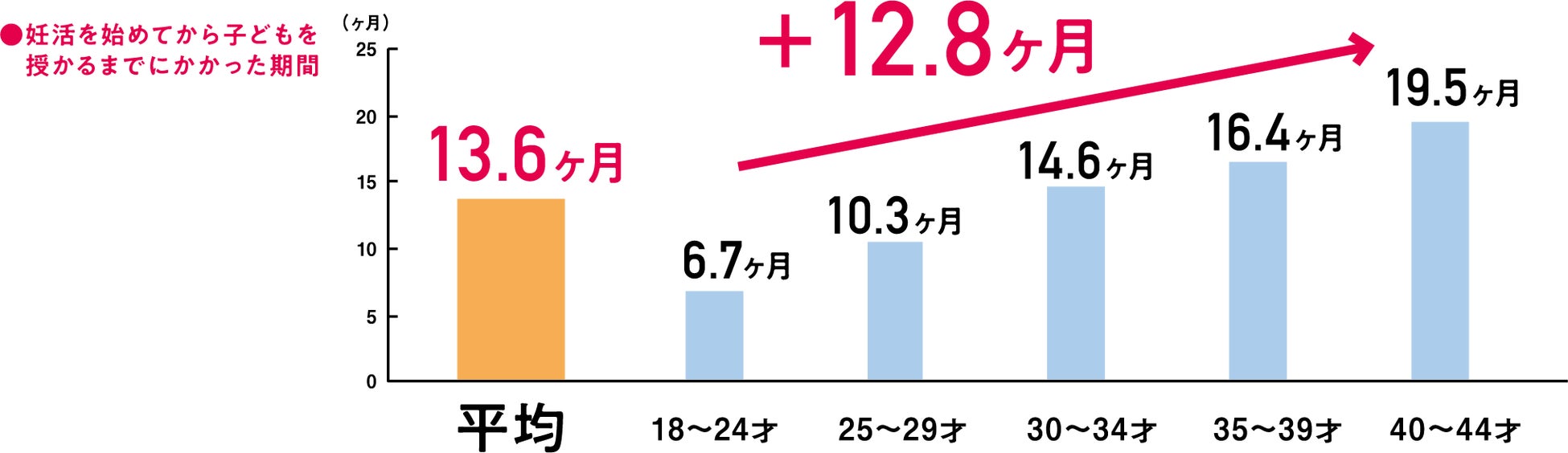 妊活を経て子どもを授かった経験のある女性が、実際に妊活を始めてから子どもを授かるまでにかかった期間の平均は13.6ヶ月という結果に。出産時(※)の年齢別に見ると、18-24才では6.7ヶ月、25-29才では10.3ヶ月、30-34才では14.6ヶ月、35-39才では16.4ヶ月、40-44才では19.5ヶ月と、年齢が上がるにつれて期間が伸びる傾向が見られました。 (※)現在妊娠中の場合は現在