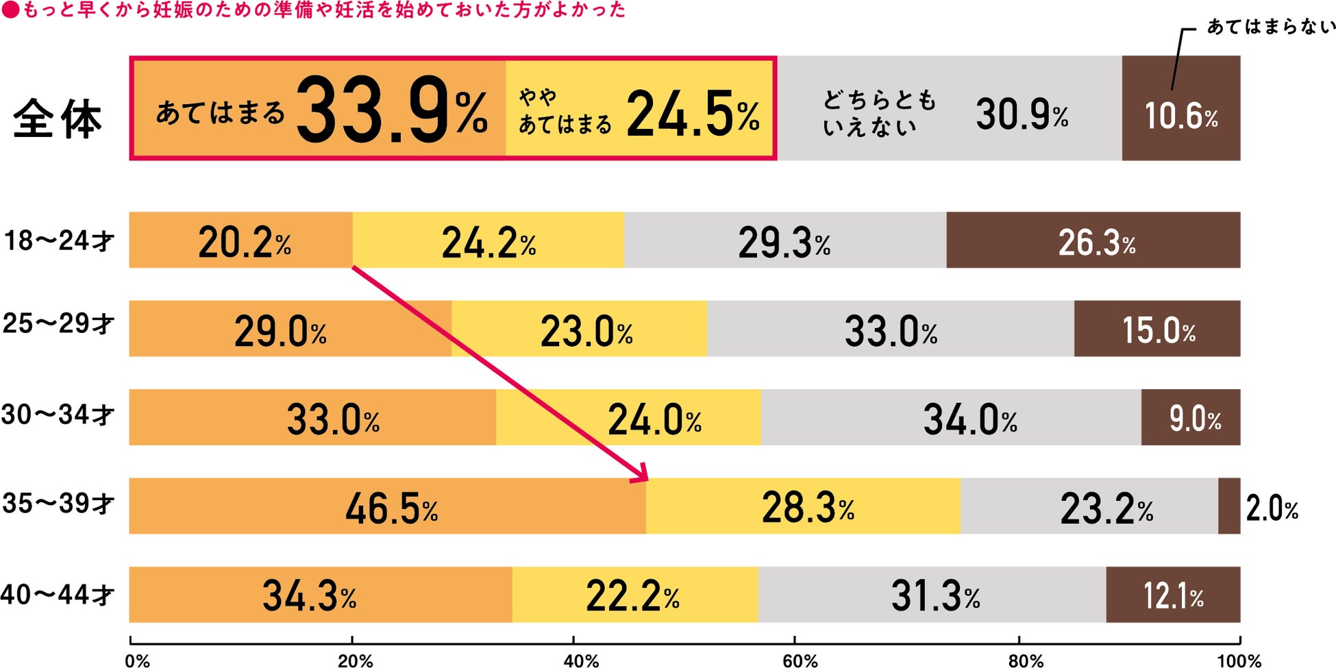 実際に妊活を経て子どもを授かった経験のある女性の68.8%が、「妊活開始前に想像したよりも妊娠は成功しづらい」と回答。58.4%は「もっと早くから妊娠のための準備や妊活を始めておいた方が良かった」と答えました。出産時の年齢が上がるにつれて、いずれの問いに対する割合も上昇し、30代後半で出産した層においては、どちらも7割を超えています。