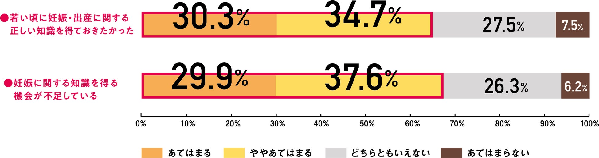 妊活を経て子どもを授かった経験のある女性の65.0%は、「若い頃に妊娠・出産に関する正しい知識を得ておきたかった」、67.5%は「妊娠に関する知識を得る機会が不足している」と答え、早くから正しい知識を得ることの必要性も明らかとなりました。