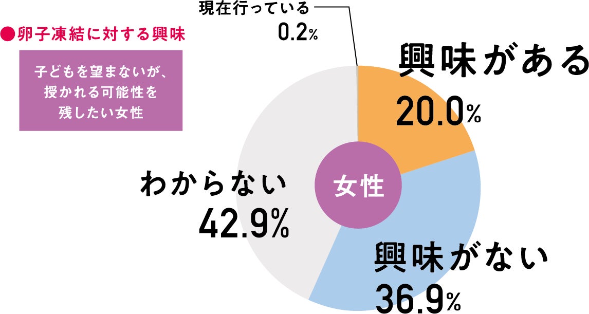 「将来考えが変わったとき子どもを授かれるよう、妊娠できる身体の状態を維持しておきたい」と答えた妊活備え派の女性のうち、約5人に1人は「卵子凍結に興味を持っている」と回答。