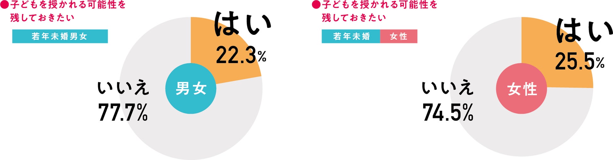 若年未婚男女の半数以上が子どもを望んでいない。しかしそのうちの女性の約4人に1人は、将来考えが変わった時のために、子どもを授かれる可能性は残したいと希望。