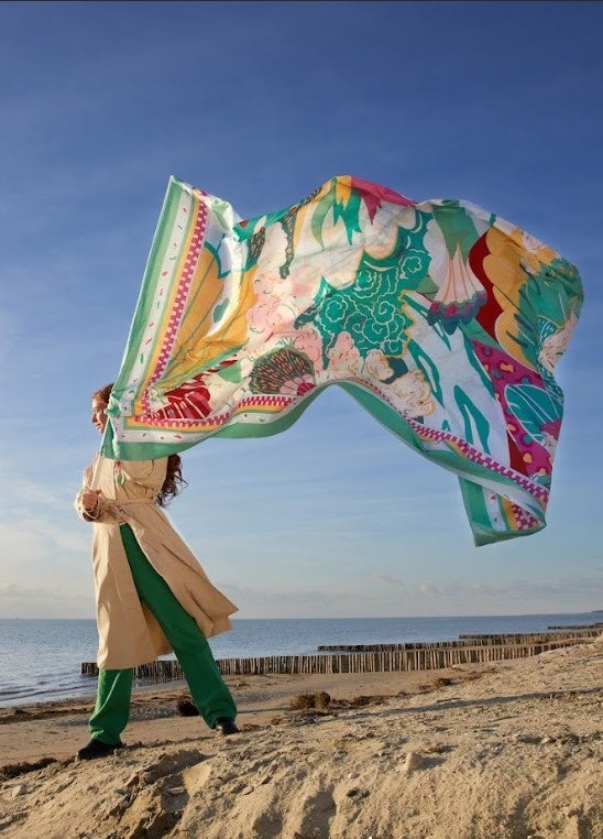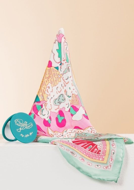 パリジェンヌにとってファッションの定番、スカーフ。自由に羽ばたく鳥と雲を描いたユニークなデザインは、揺れる度に表情を変え、色鮮やかに春のファッションの幅を広げます。100%リサイクル素材のサテン生地で、シルクのような肌ごこちを実現。色とりどりのカラーをMIXしているので、カラーコーディネイトも簡単。バッグなどに巻いて使うのもオススメです。風とともに舞う鳥のイラスト付きのコンパクトミラーは、バッグに忍ばせるのにぴったりなスマートサイズです。