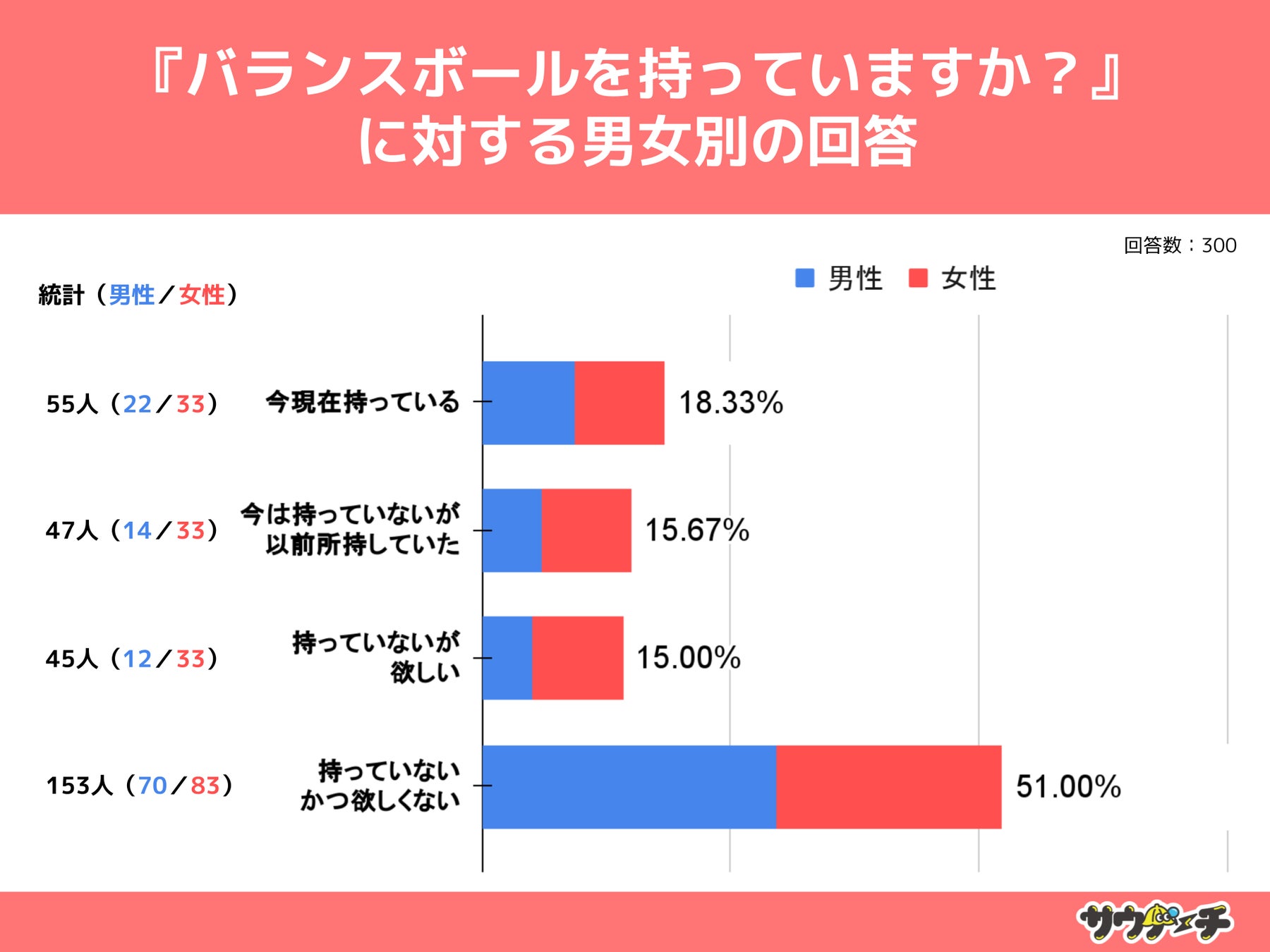10〜30代男女を対象とした『バランスボールを持っていますか?』というアンケートで、最も多かった回答は「持っていないかつ欲しくない」で51%でした。