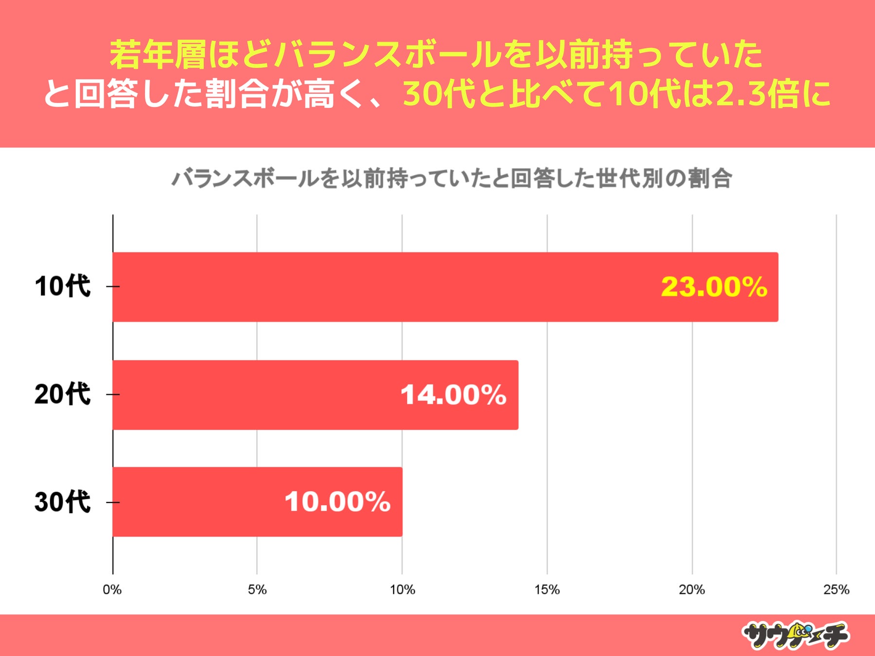 バランスボールを以前持っていたと回答した割合を世代別でみてみますと、10代の23%が最も高く、次いで20代の14%、30代が10%で、30代と比べて10代は2.3倍高い結果となりました。
