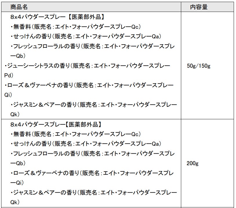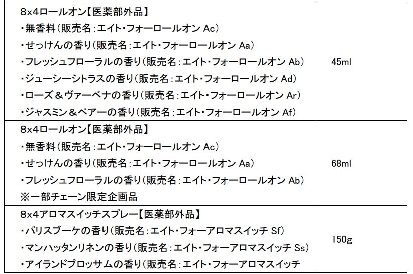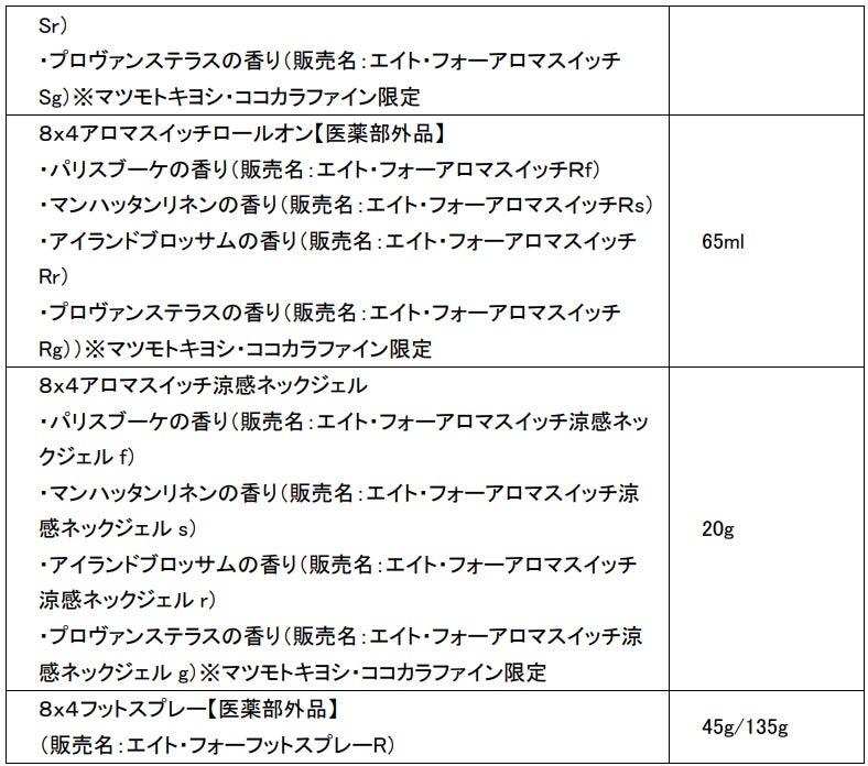 『パウダースプレー【医薬部外品】』、『ロールオン【医薬部外品】』、『アロマスイッチスプレー【医薬部外品】』、『アロマスイッチロールオン【医薬部外品】』、『アロマスイッチ涼感ネックジェル』、『フットスプレー【医薬部外品】』