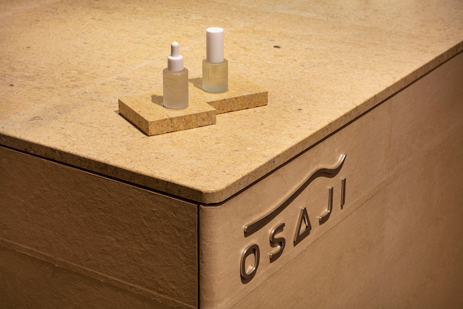 また、OSAJIらしく日本の色・質感を伴った空間となるように、和紙で覆われた柔らかい印象のカウンターに、国産の石から切り出された天板が置かれています。