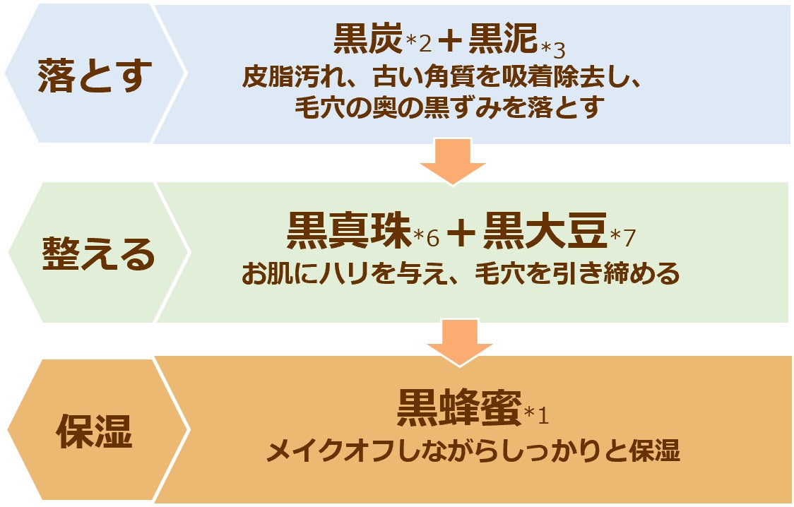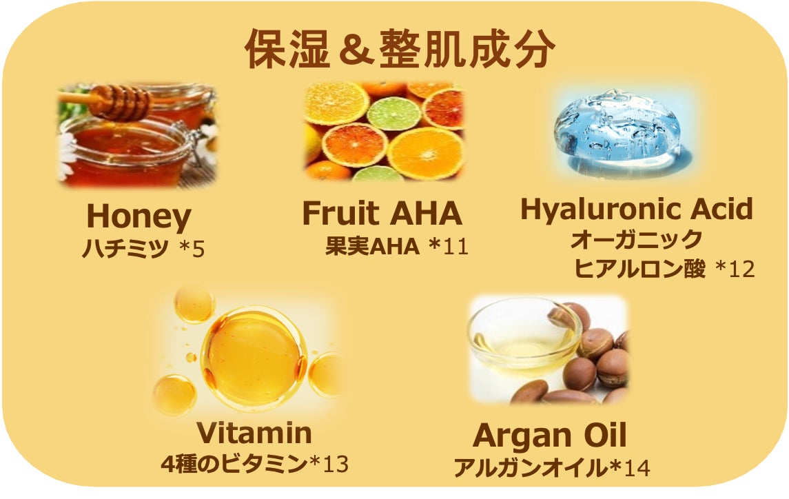 *1 ハチミツエキス(保湿) *2 炭(吸着) *3 海シルト(吸着) *4 ハチミツエキス(保湿)、炭(吸着)、海シルト(吸着)、コメエキス(保湿)、加水分解ダイズエキス(保湿)、黒砂糖(保湿)、加水分解コンキオリン(保湿)、アスコフィルムノドスム/ヒバマタ/ヒジキ/トロロコンブ/レソニアニグレスセンス/ミツイシコンブ/リシリコンブ/ワカメエキス(保湿) *5 保湿 *6 加水分解コンキオリン(保湿) *7 加水分解ダイズエキス(保湿) *8 コメエキス(保湿) *9 アスコフィルムノドスム/ヒバマタ/ヒジキ/トロロコンブ/レソニアニグレスセンス/ミツイシコンブ/リシリコンブ/ワカメエキス(保湿) *10 黒砂糖(保湿) *11 オレンジ果汁、レモン果汁、グレープフルーツ果実エキス、リンゴ果実エキス、ライム果汁、ナツメ果実エキス、サンザシエキス(全て角質ケア)  *12 加水分解ヒアルロン酸(保湿) *13 トコフェノール、パンテノール、パルミチン酸レチノール、テトラヘキシルデカン酸アスコルビル(全て整肌) *14 アルガニアスピノサ核油(保湿) *15 加熱処理しないハチミツ(保湿) *16 ライム果汁(香気・保湿)