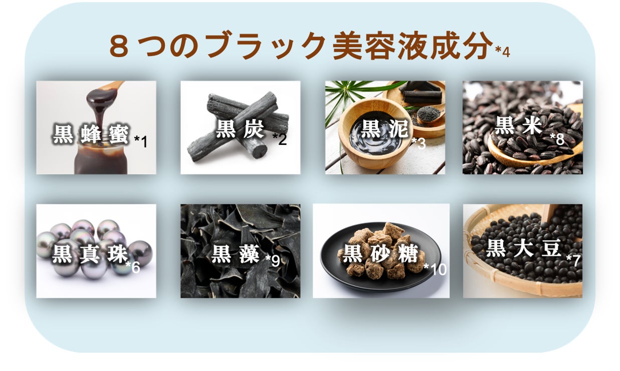 角栓を吸着する、黒炭*2・黒泥*3や、角質オフ後のお肌をキュッと引き締めハリを与える黒真珠*6や黒大豆エキス*7。黒蜂蜜*1などの保湿成分でお肌を潤し見た目も肌触りもツルツルになるよう厳選した成分を配合。