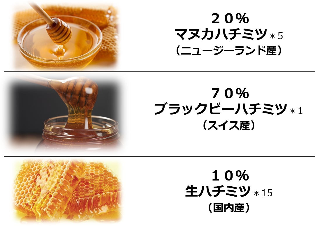 世界各地から厳選した3種のハチミツ*5を独自の比率※4で配合。ブラックビーハチミツ*1を採用することで、更なる美容効果を高めます。