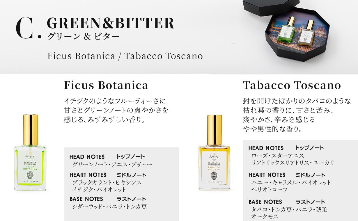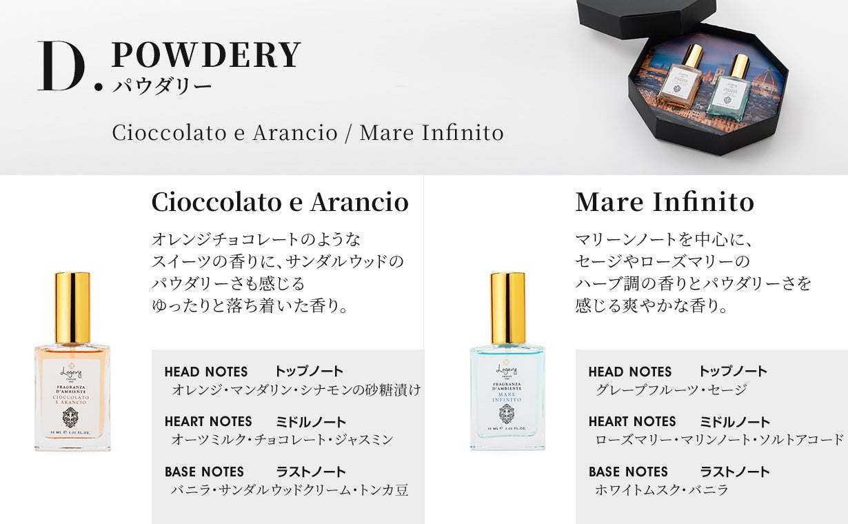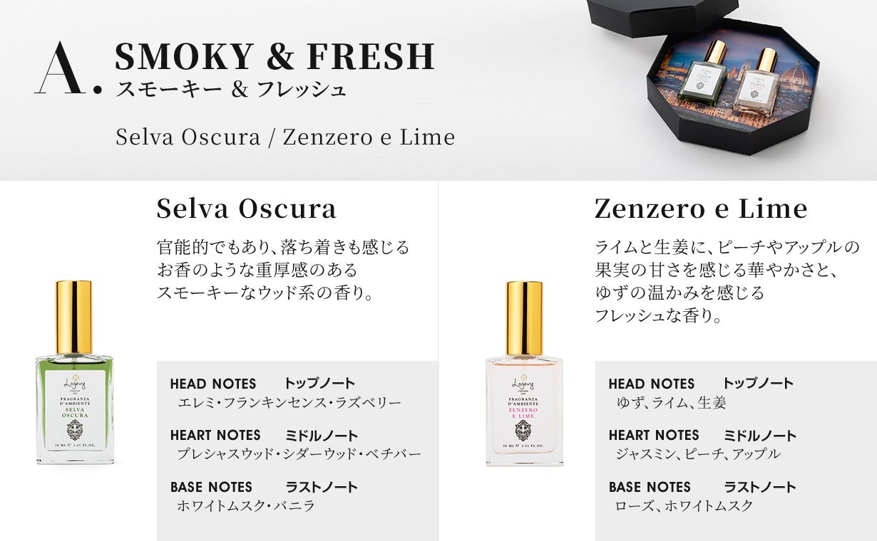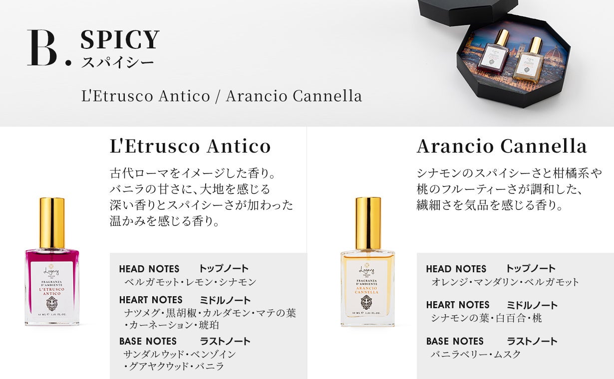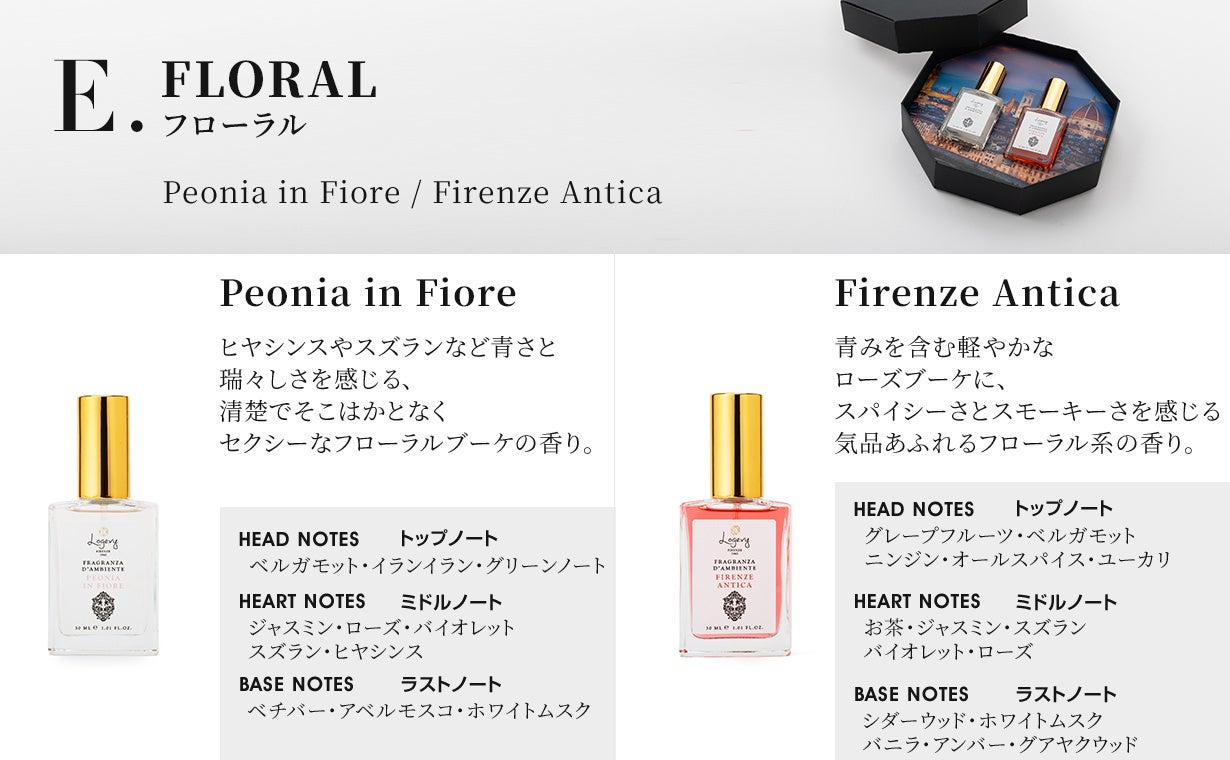 高級ルームフレグランスをお気軽にお試しいただける限定サイズ30mlのスプレータイプのイタリア・フィレンツェの伝統と革新を融合した、香り豊かなルームフレグランスです。今回は様々なシーンに合わせた幅広い香りの全10種類を揃え、各2本セットのラインナップを5つご用意しました。それぞれのセットで、2つの異なる香りをお楽しみいただけます。