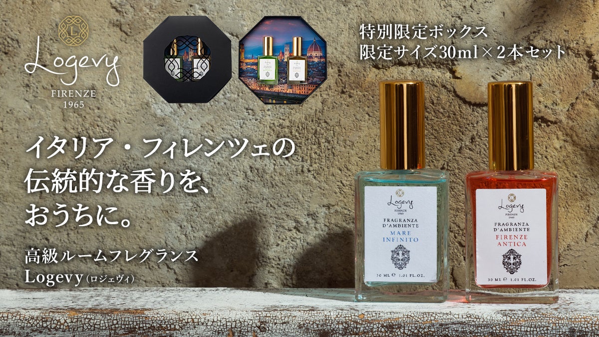 「Logevy FIRENZE 1965」日本独占販売権を有する正規代理店の株式会社エイト・バイ・テンは、日本ではまだ知名度も低く、輸入商品として高級フレグランス「Logevy」の香りをより多くの皆様にお届けしたいという想いから、今回、特別限定パッケージにてお手軽にお求めやすい価格で限定サイズ30mlを2本セットにてご提供いたします。