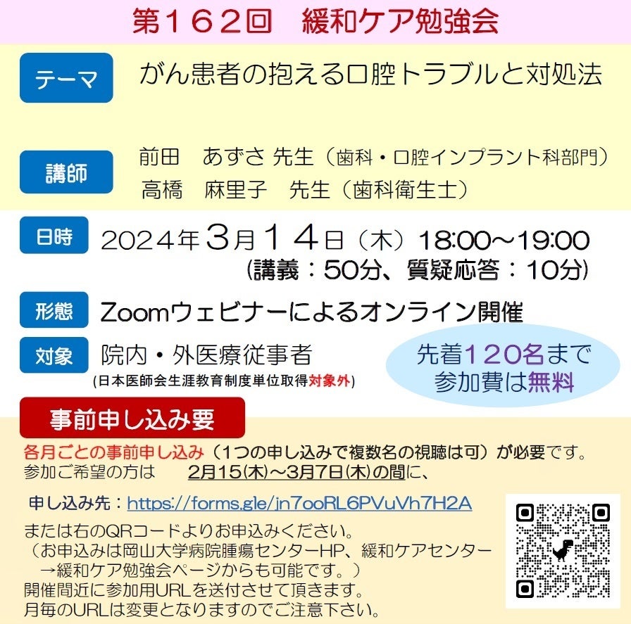 第162回緩和ケア勉強会を2024年3月14日(木)18:00~19:00に「がん患者の抱える口腔トラブルと対処法」と題して、オンラインで開催します。