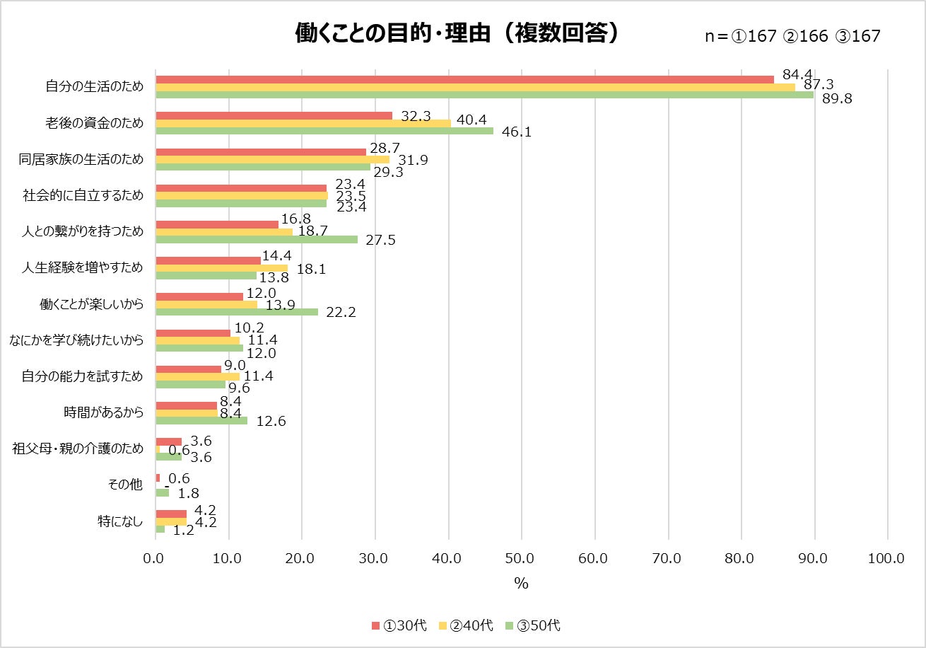 ・働く目的は「生活のため」が大多数。50代は人との繋がりや楽しさも求める傾向