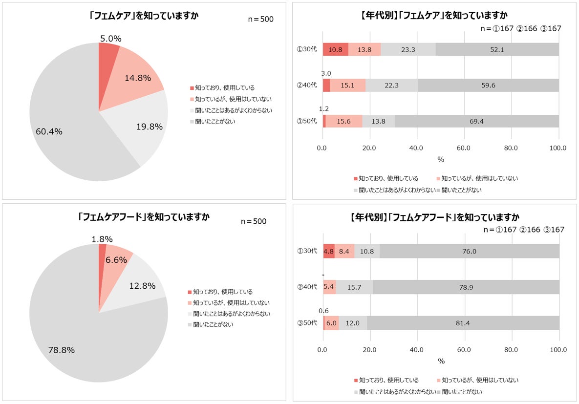 「フェムケア」認知度は19.8%。40代・50代より30代の方が高い傾向。「フェムケアフード」認知度は8.4%