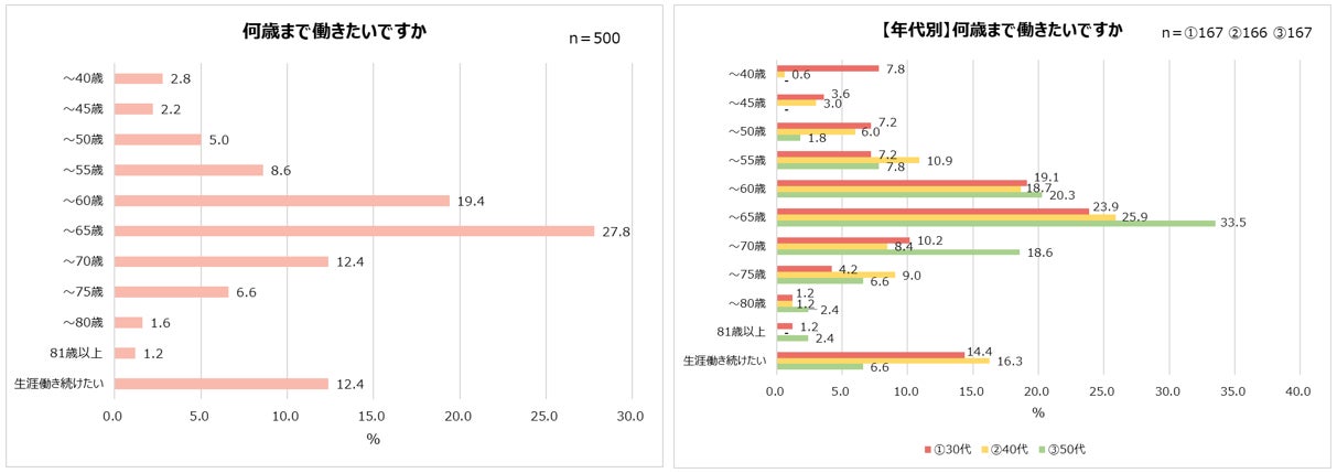 何歳まで働きたいか聞いた質問では、多くの企業で定年とされる「~60歳(19.4%)」「~65歳(27.8%)」と回答した人が全体の約半数を占めました。「生涯働き続けたい」と回答した人も12.4%いました。