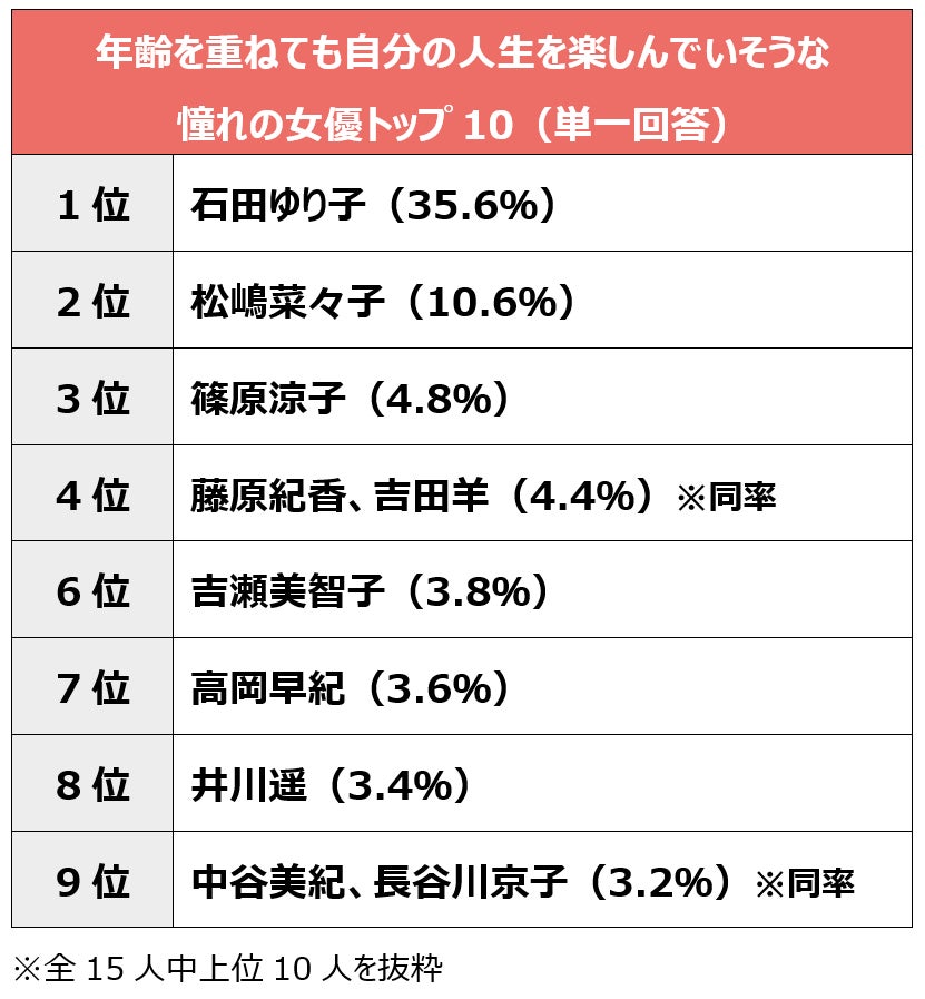 最後に、年齢を重ねても人生を楽しんでいそうな、憧れの女優を回答してもらいました。1位は石田ゆり子さん(35.6%)、2位は松嶋菜々子さん(10.6%)、3位は篠原涼子さん(4.8%)という結果になりました。