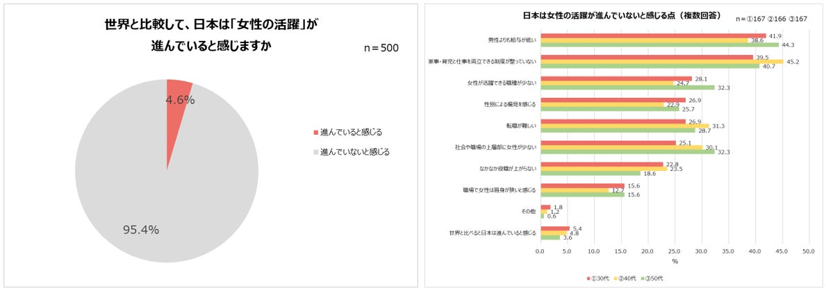 ・日本は女性の活躍が進んでいないと感じる人95%「男性より給与が低い」「家事と両立できる制度が足りない」