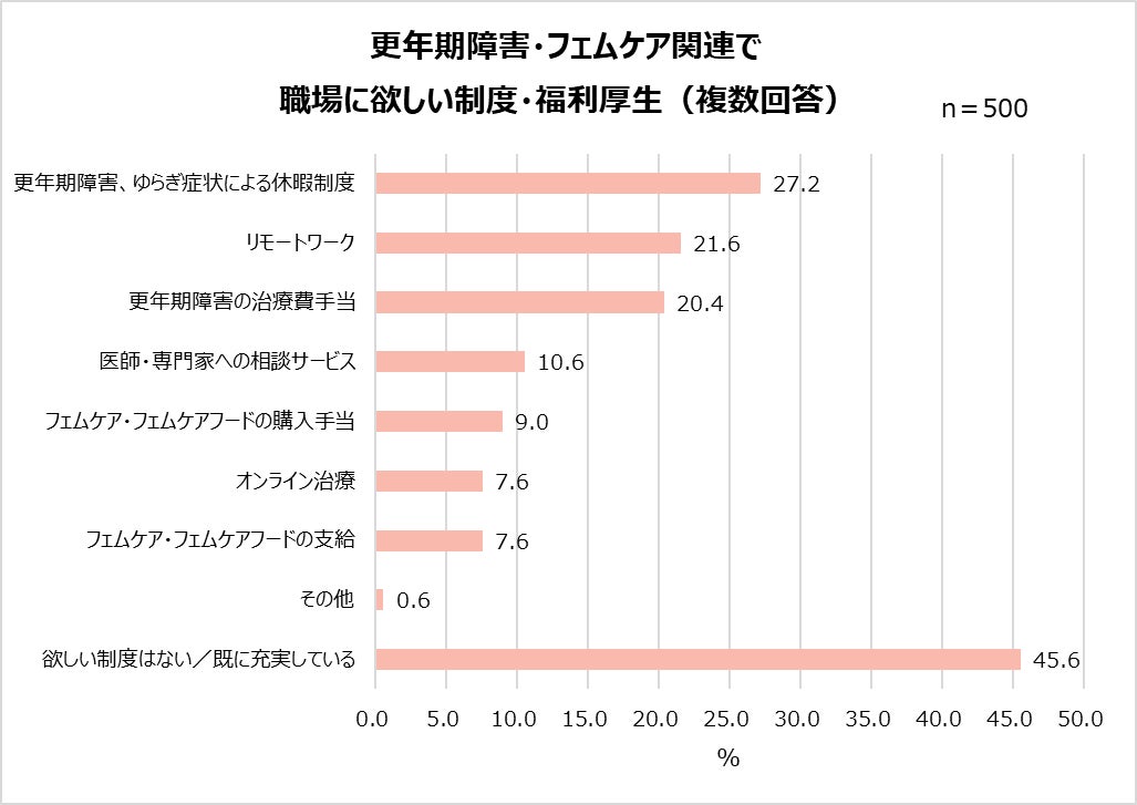 職場に更年期障害関連の制度が欲しい人は半数以上。特に「更年期障害、ゆらぎ症状による休暇制度」