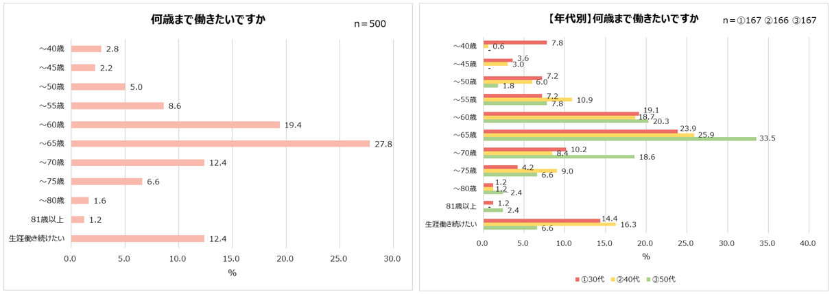 何歳まで働きたいか聞いた質問では、多くの企業で定年とされる「~60歳(19.4%)」「~65歳(27.8%)」と回答した人が全体の約半数を占めました。「生涯働き続けたい」と回答した人も12.4%いました。