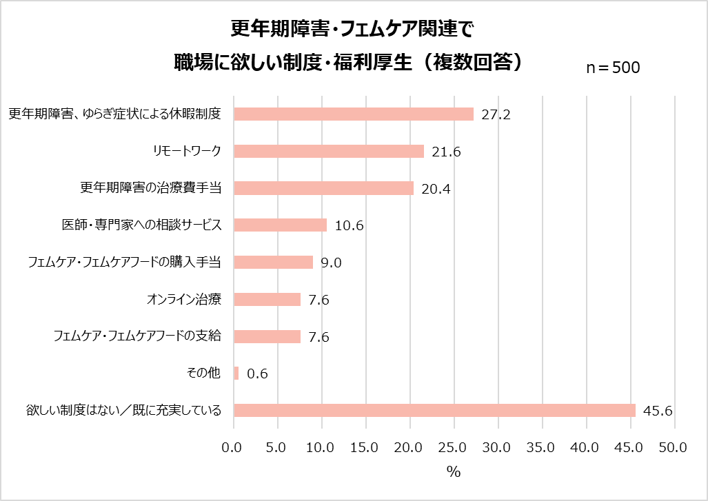 職場に更年期障害関連の制度が欲しい人は半数以上。特に「更年期障害、ゆらぎ症状による休暇制度」