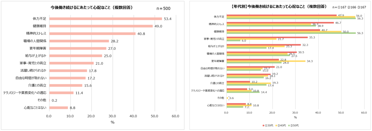 ・働き続ける上での不安1位「体力不足」2位「健康維持」。「更年期障害」は5位に