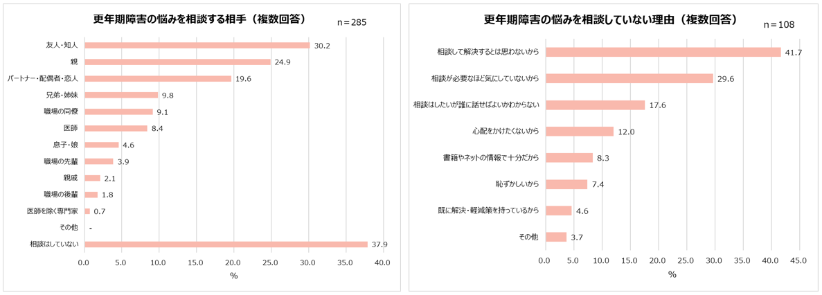 更年期障害の悩みについて相談する相手がいる人は約6割でした。相談していない人にその理由を聞いたところ、「相談して解決するとは思わないから(41.7%)」「相談が必要なほど気にしていないから(29.6%)」という声がありました。