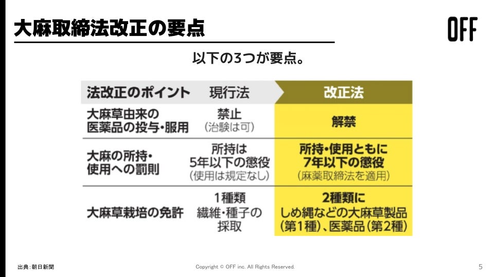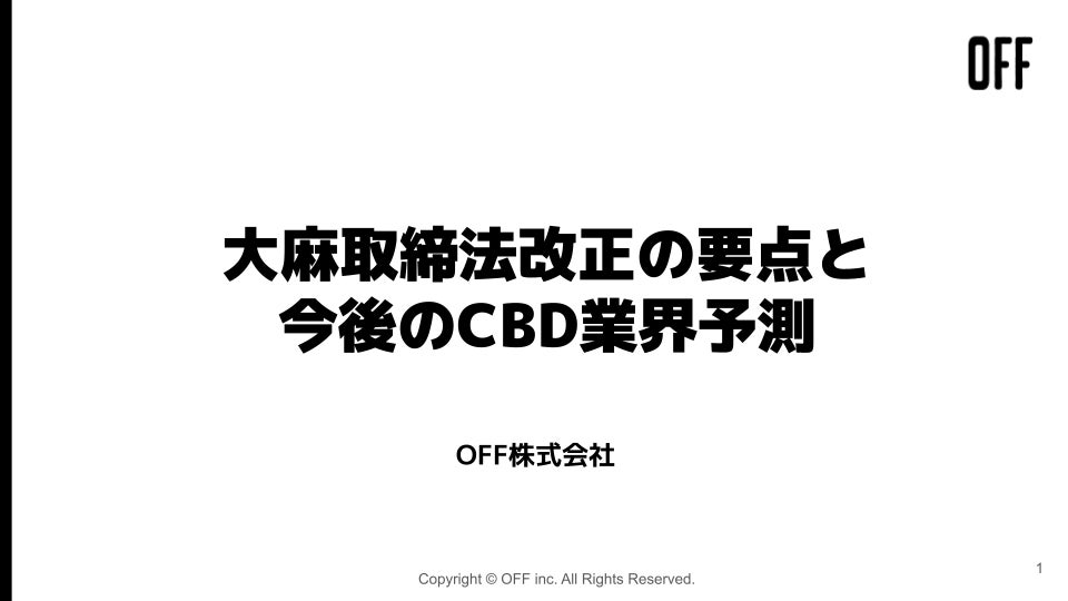 CBD原料の卸売・OEM(製造受託)事業及びオリジナルブランド「tokyo mooon」を運営するOFF株式会社(本社:東京都目黒区、代表取締役:駒形・井上、以下「OFF」)は、米国市場の最新動向、厚生労働省等の公開資料を元に「大麻取締法改正の要点と今後のCBD業界予測」のホワイトペーパーを公開いたしました。