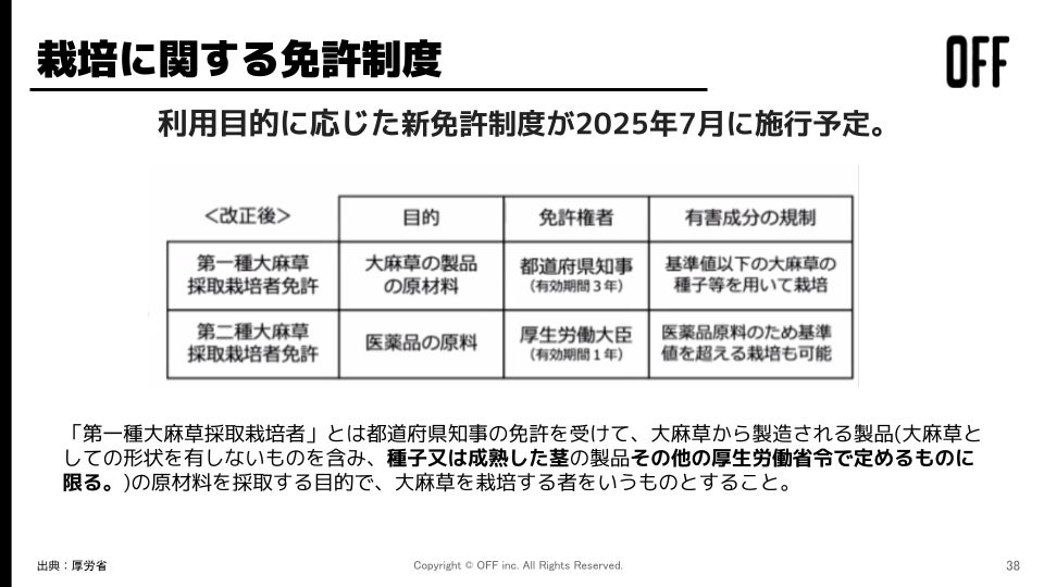 今後の国内での栽培・抽出・成分分析についても解説をしています。栽培免許が見直される理由、免許制度の概要、原料抽出や種子の輸入、THCの分析体制といった論点についても網羅しています。