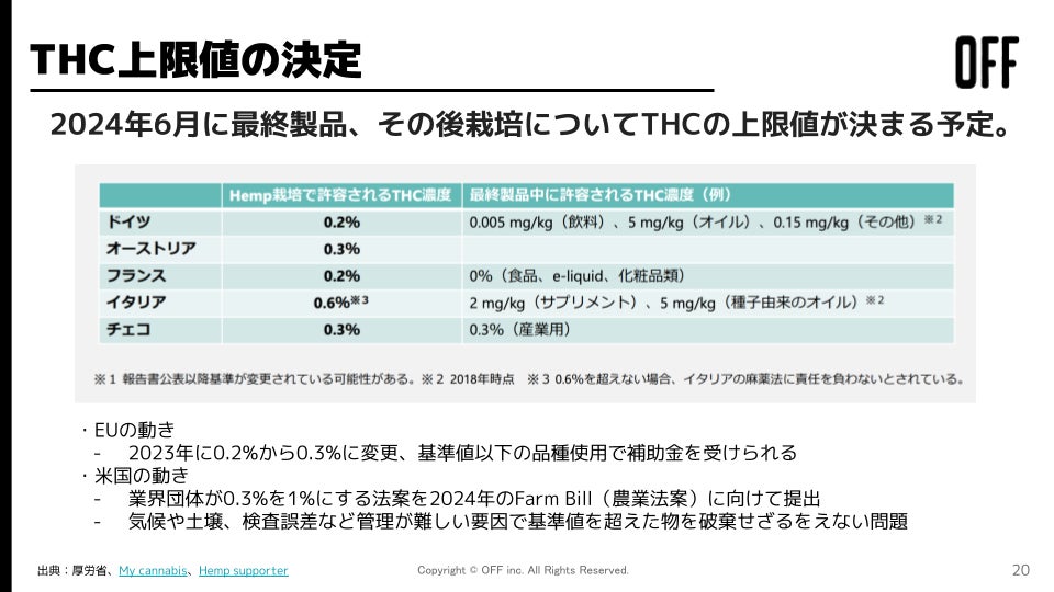 厚労省の見解によると2024年6月に最終製品、その後栽培についてTHCの上限値が決まる予定です。また、EUや米国の動きについても記載しています。その他のページでは、「部位規制の廃止」「大麻草の花や葉の扱い」についてもまとめています。