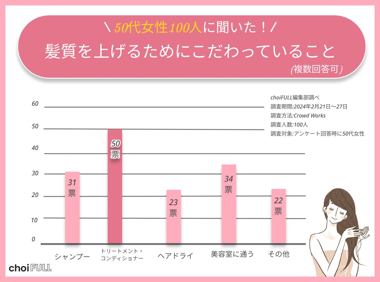 50代女性100人に髪質を上げるためにこだわっていることを聞いたところ、半数が「トリートメント・コンディショナー」と回答しました。そのように回答したのには、以下のような理由があります。