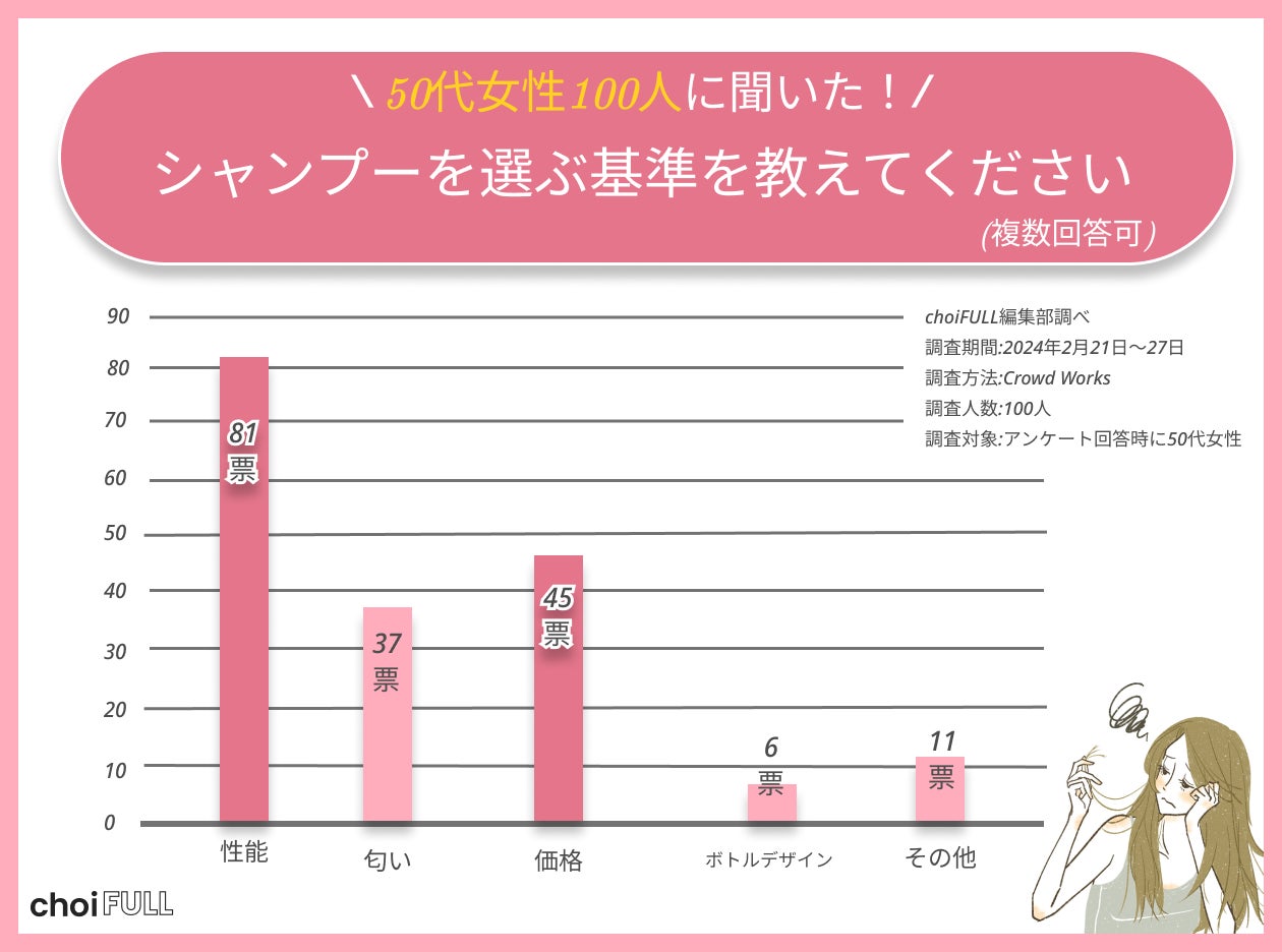 50代女性にシャンプーを選ぶ基準を聞いたところ、8割以上が「性能」と回答しました。さらに、約5割が「価格」という結果になりました。そのように回答したのは、以下の理由が挙げられます。