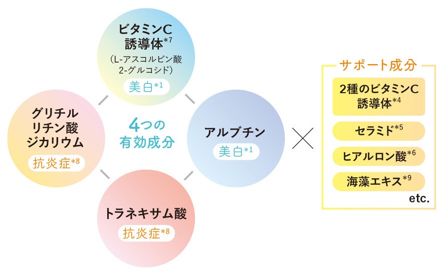 4つの有効成分でメラニンの生成を抑え、「ビタミンC誘導体※4、アルブチン、トラネキサム酸、グリチルリチン酸ジカリウム」で、多角的アプローチが可能な処方を開発しました。