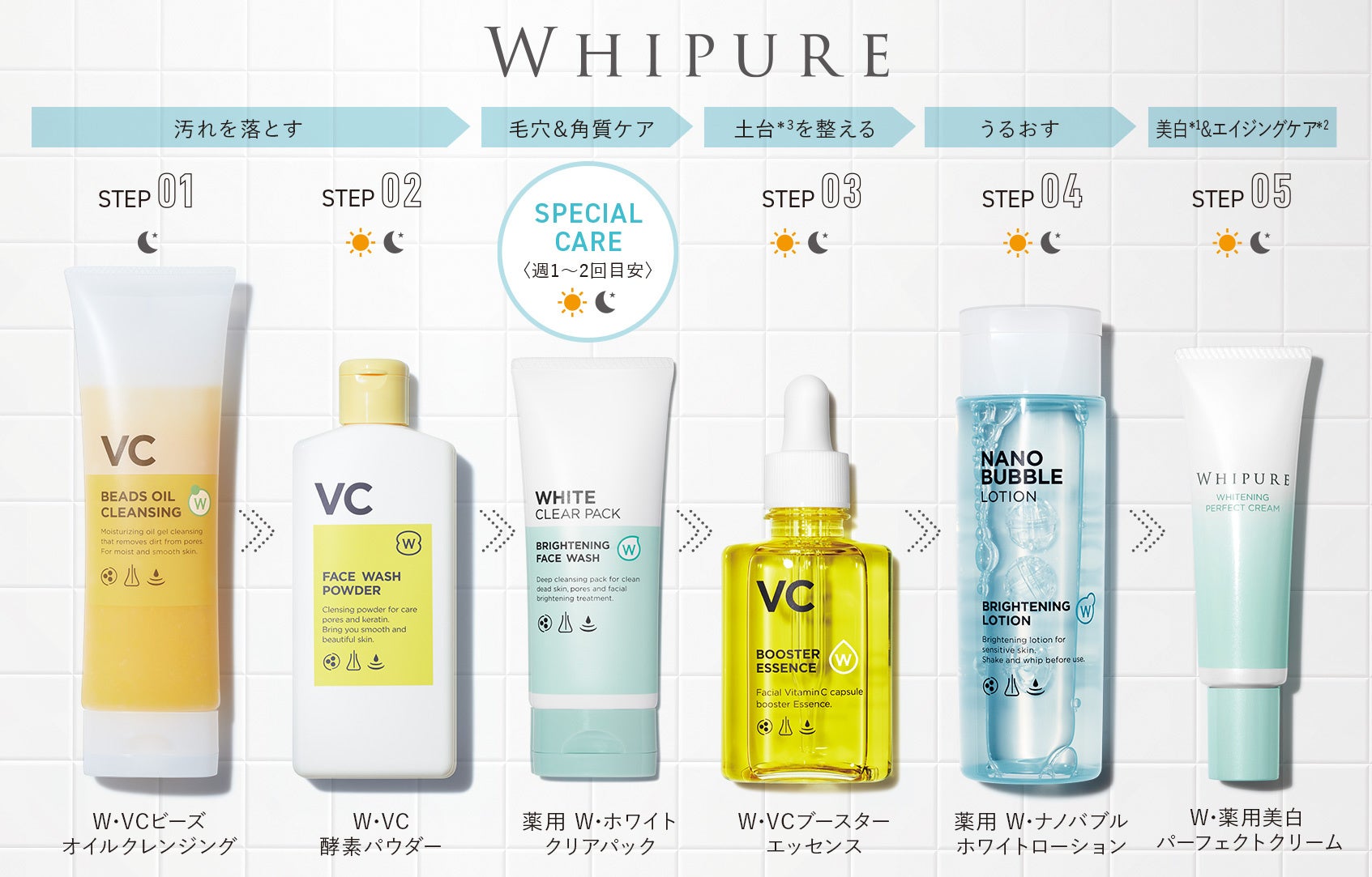 美肌は毎日の自宅ケアで目指す時代―。そんなこだわりと確信から生まれたのが、「WHIPURE(ホワイピュア)」皮膚科学の研究から肌のコンディションに着目し、厳選した成分、新しいテクノロジー、肌へのうるおい継続を目指し、肌環境を高める処方へのこだわり。キレイを目指す、すべての女性の悩みをサポートします。