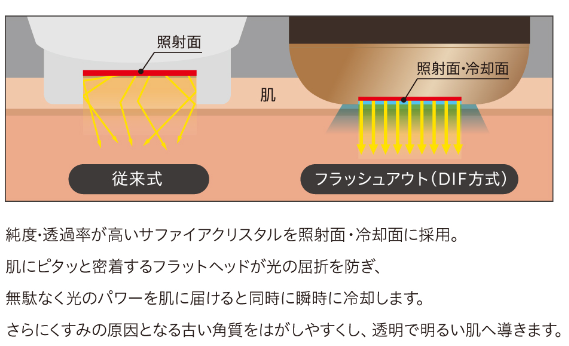ジュピター フラッシュアウトは、DIF方式(ディープインパクトフラッシュ)を採用しており、「熱くない・痛くない・肌へのダメージを防ぐ」ことができ、快適にムダ毛ケアを行うことができます。