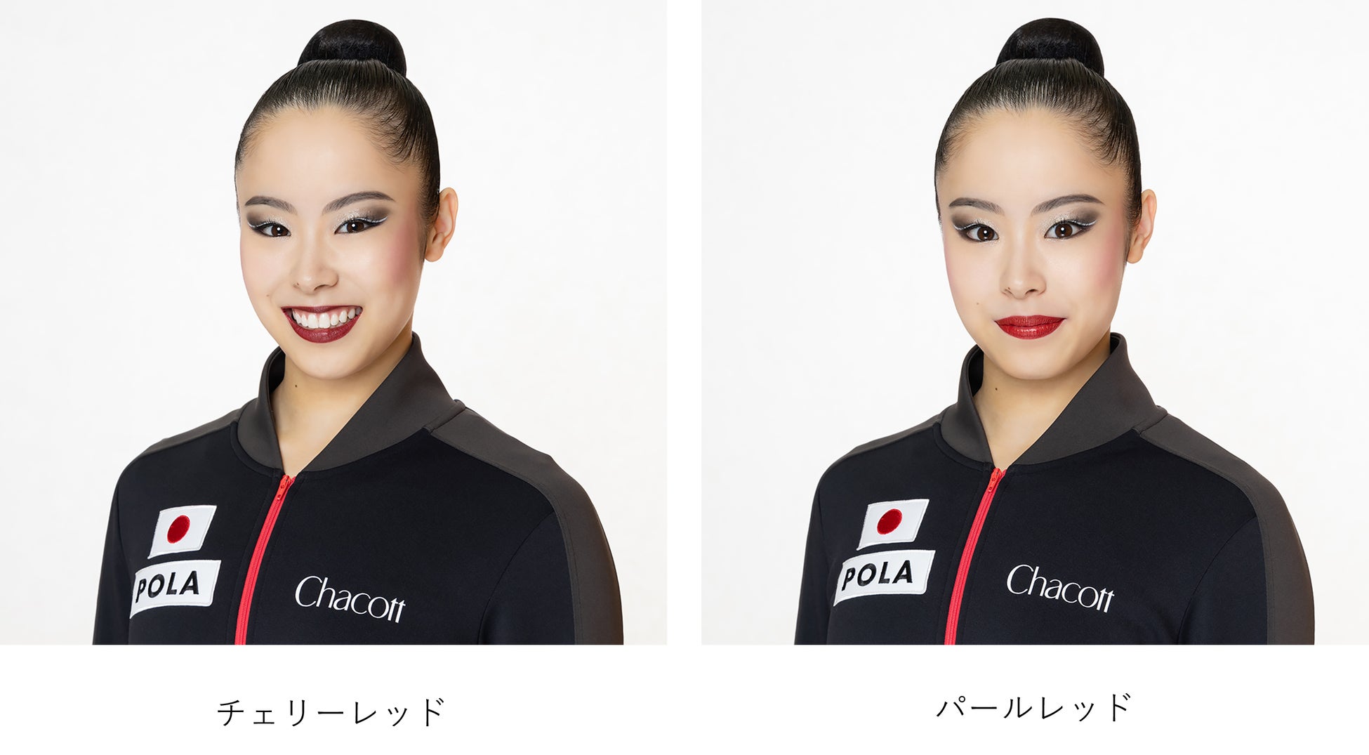また、選手からの「ラメを使いたい!」という希望を叶えるため、まるで夜空に輝く星のようにシルバーとゴールドのラメを高配合したアイカラーを開発。黒のアイカラーを目尻に、ラメのアイカラーを目頭に塗布することで、クールさと華やかな印象を両立させました。リップは衣装や演技によって使い分けられるように、深みのあるチェリーレッド、パールを効かせた華やかなパールレッドの2色を開発。アイカラーの印象をより引き立てます。