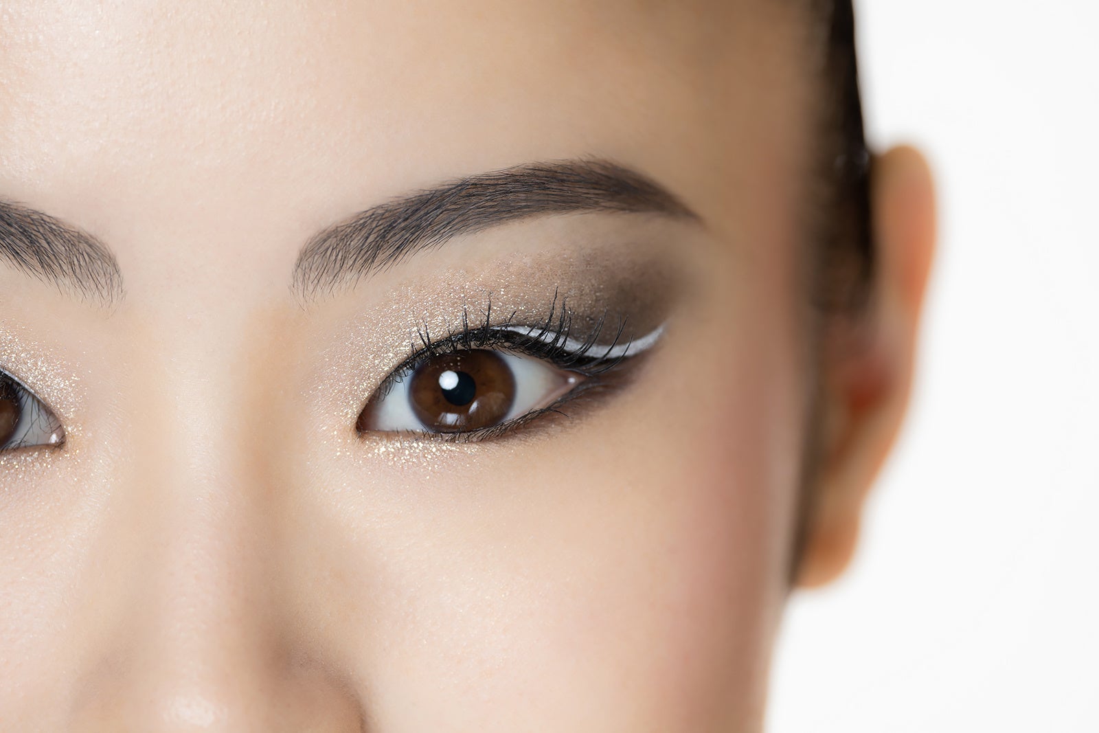 メークのポイントになる、月の光をイメージした白のアイライン。目尻から1cm程度長さを出すことで、目力を引き立てます。アイカラーの黒と重なることで、薄い青みを帯びた月白(げっぱく)色になり、白目をきれいに見せる効果も。