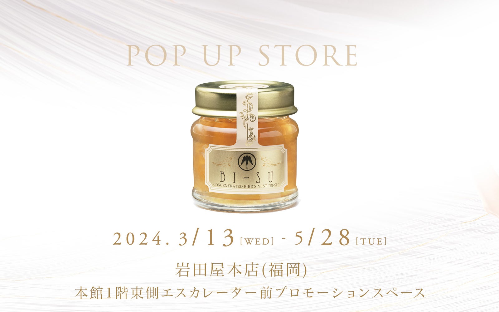 エムスタイルジャパン株式会社(本社:福岡市中央区、代表取締役:稲冨幹也)の天然アナツバメの巣を使用したサステナブルコスメブランド「BI-SU<ビース>」は、2024/3/13(水)〜5/28(火)に、岩田屋本店 本館1階プロモーションスペースにてポップアップストアを開催いたします。