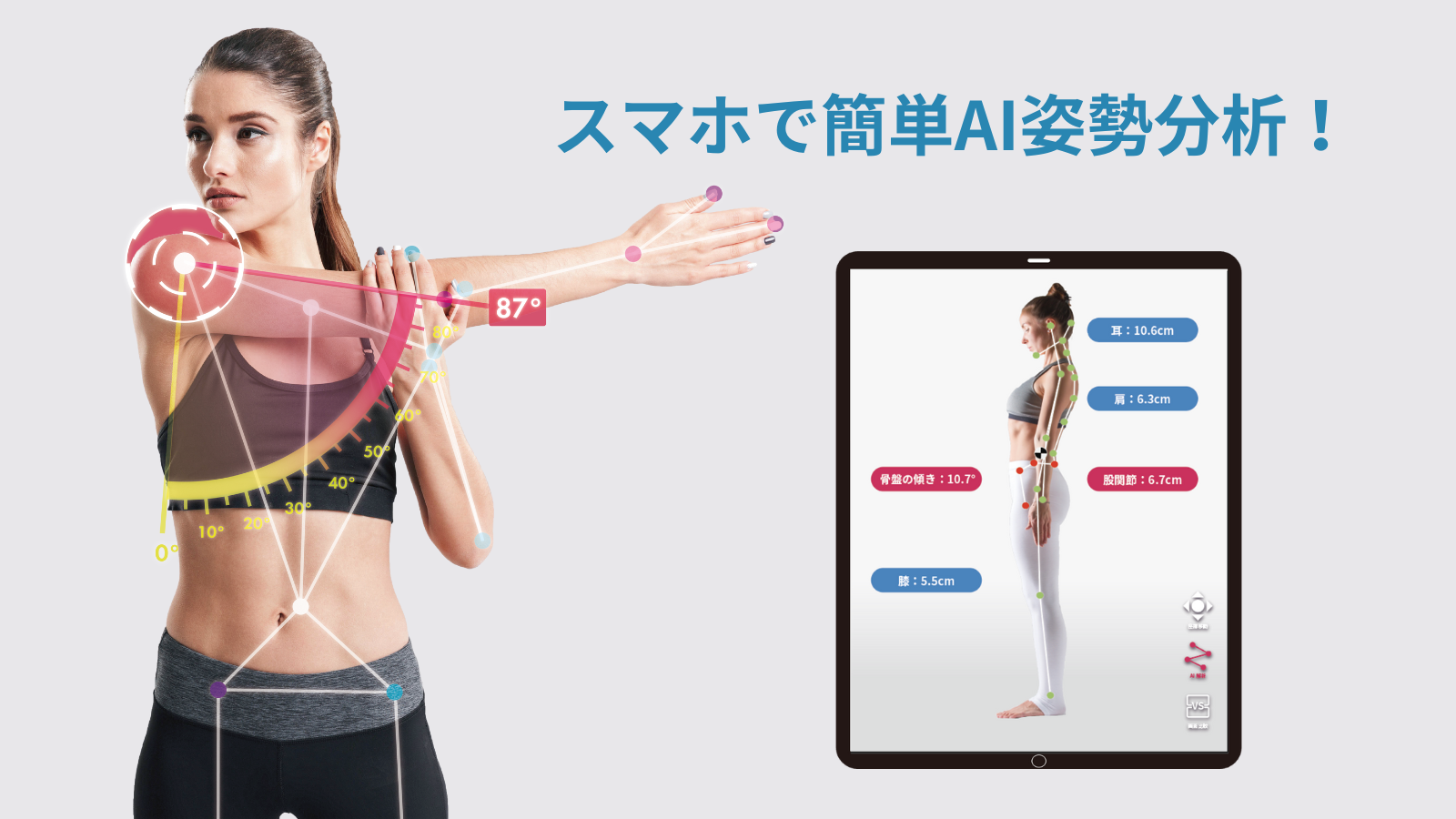 『Sportip Pro』は、ジム・整体/接骨院・デイサービス等のアセスメントをAIで効率化・高度化することで売上アップ・コストカットを支援するAIアプリです。スマートフォン・タブレットで撮影するだけで個人の身体情報を可視化し、適切な運動メニューをわずか ”1秒” のうちに提供可能です。4種の姿勢分析機能やROMテスト機能・歩行分析機能・ジャンプ計測機能など200を超える測定機能から、2000を超える運動メニューがクライアント様・会員様へぴったりな形で自動提案されます。
