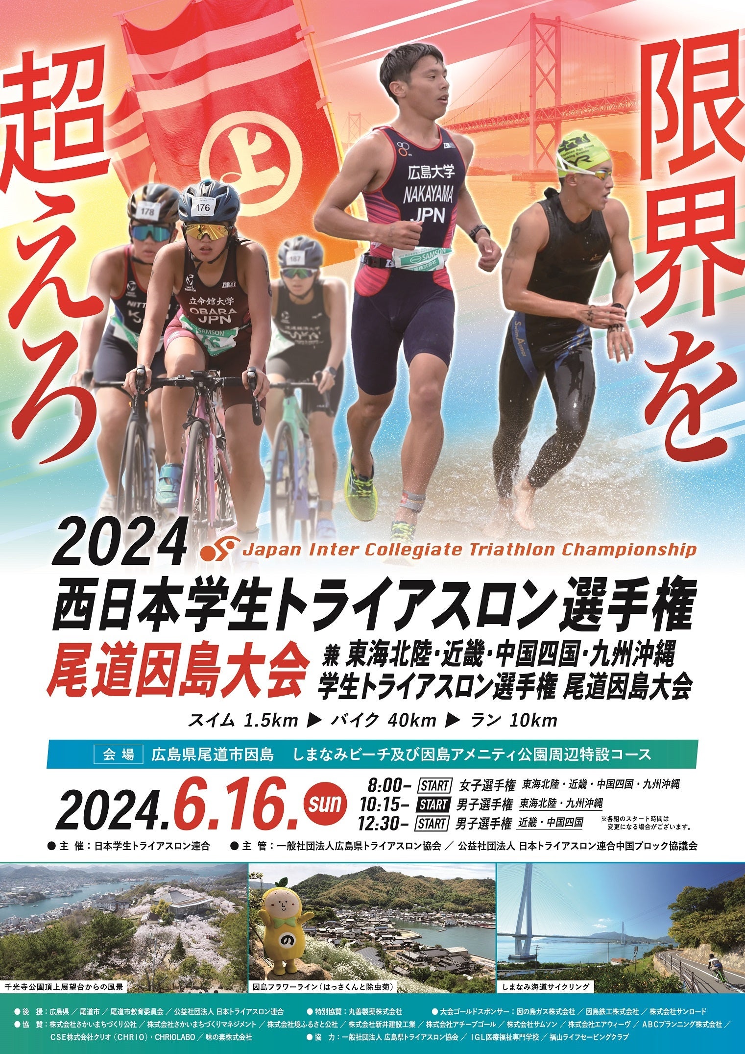日本学生トライアスロン連合(JUTU)が主催する「2024西日本学生トライアスロン選手権尾道因島大会」は、本年9月に開催される「2024日本学生トライアスロン選手権観音寺大会」の予選会となります。尾道市因島では2度目の開催となる本大会を通じて、青少年の健全育成と、トライアスロンの普及と認知度向上に貢献していきます。