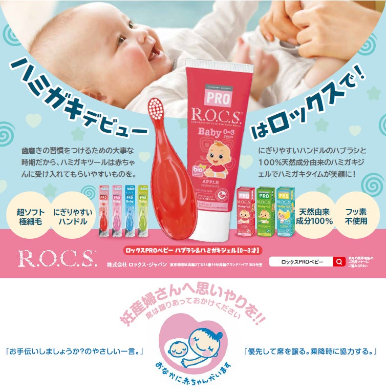「安心、効果、安全」をブランド哲学として世界に50か国以上で販売されるオーラルケアの一大ブランド【R.O.C.S】。2018年6月に日本進出を果たした株式会社ロックス・ジャパンは、ベビーのお口のことを一番に考えた100%天然由来の歯みがき『ロックスPROベビー』&磨きはじめのベビーのお口に優しい『ロックスPROベビーハブラシ』と、厚生労働省が発行する「マタニティマーク」のタイアップ広告を2024年1月1日より1年間、都営地下鉄大江戸線、都営地下鉄三田線の車内にて掲示します。今回のタイアップ実施により、妊産婦への配慮や、やさしい環境づくりを推進する「マタニティマーク」の普及促進をサポートします。
