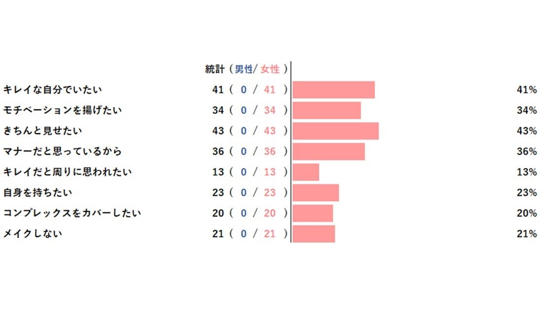 女性の皆さんがメイクをする理由として、自分のことをきちんと見せたり、マナーの部分であったりと、他の人からどう見られるかを一番気にしていることがわかりました。