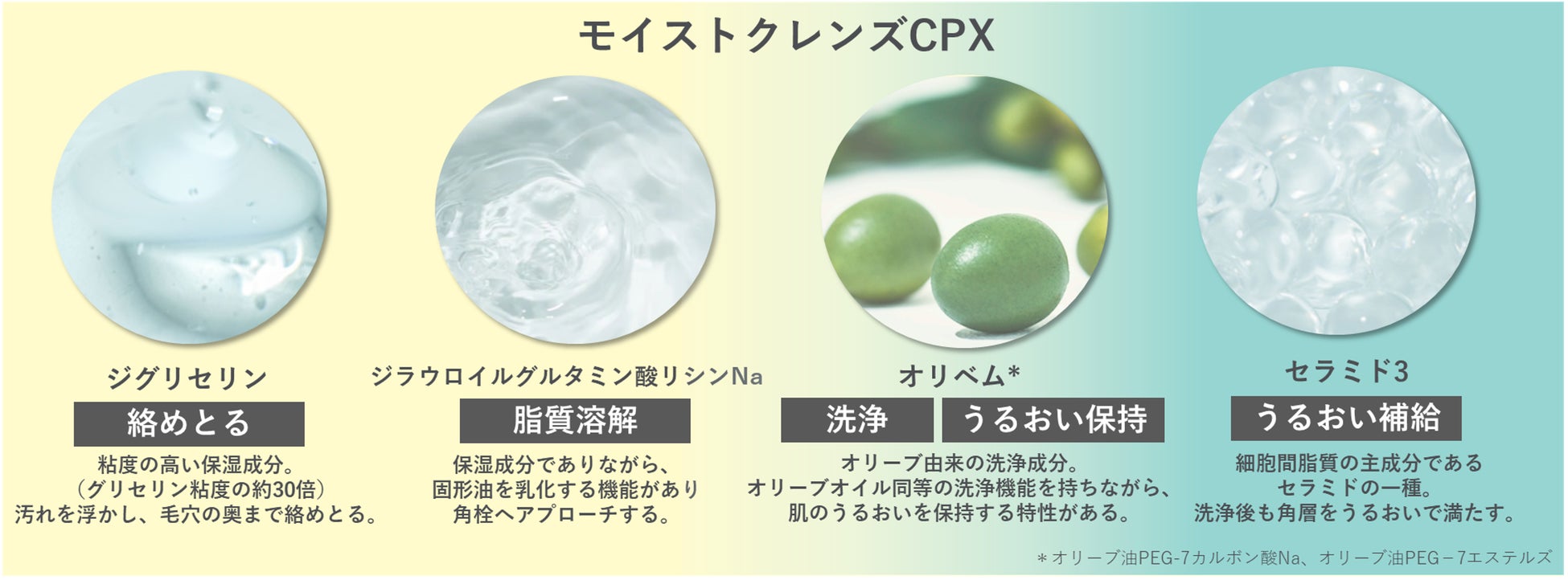 グリセリンよりも約 30 倍の粘度がある保湿成分『ジグリセリン』が肌表面の汚れを浮かせ、そこにオリーブ由来のマイルドな洗浄成分『オリベム*2』が結びつくことで、肌への負担を抑えながら、メイク・皮脂汚れをスッキリとオフします。