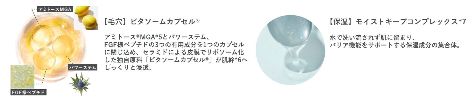 約2年の月日をかけ開発した独自原料「ビタソームカプセル® 」をはじめ、洗い流されずに肌にとどまる次世代*3保湿成分「モイストキープコンプレックス」など厳選有用成分を配合し、クレンジングをするたびに素肌をみずみずしくケア。毛穴や乾燥、くすみ*4にアプローチし、土台から健やかで美しい肌を目指します。