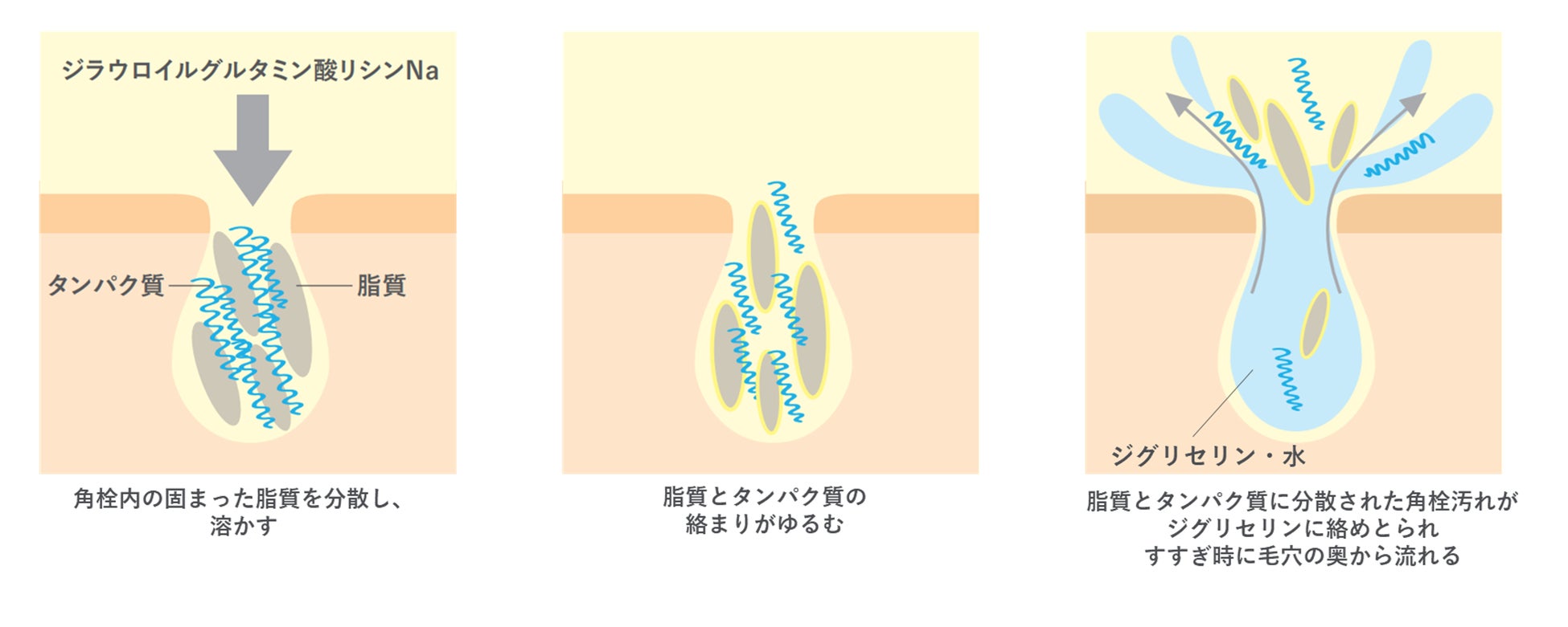 脂質とタンパク質が絡まりあった”角栓汚れ”に、脂質溶解機能を持つ『ジラウロイルグルタミン酸リシンNa』がアプローチ。さらに高粘度のジグリセリンが毛穴の奥から角栓汚れを絡めとり、洗い流します。