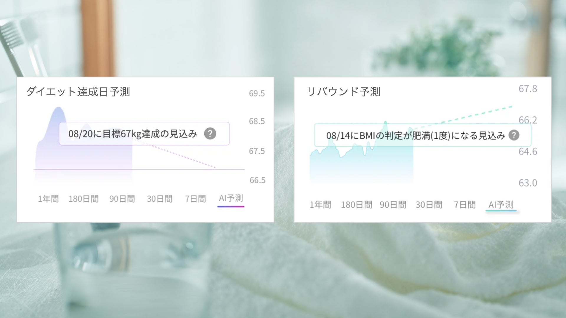 体重変化の傾向をAIが解析し、未来の体重変化を先読みします。もしダイエットをしているのなら、目標達成の予定日を提示します。ダイエット後のリバウンドの傾向に気づくこともできます。努力の成果がすぐにわかるため、モチベーションの向上につながります。