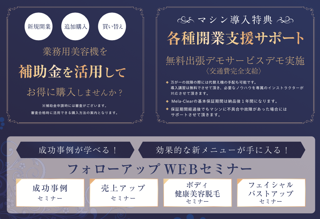 購入希望サロン様には補助金活用のアドバイス、フォローアップwebセミナー(成功事例の共有、売上アップのアドバイス、その他技術的なセミナー)も行なっています。マシン導入特典として「各種開業支援サポート」の無料出張デモサービス、故障時の代替え機手配の他、導入講習で必要なノウハウを専属インストラクターが対応しています。