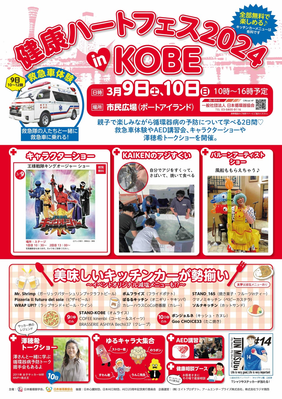 『健康ハートフェス2024 in KOBE』は神戸市民を対象とした心臓病啓発イベントです。キャラクターショーなどのお子様向けイベントをご用意して「親子」での参加を呼びかけることにより、お子様への心臓病啓発のみならず、親世代、祖父母世代への啓発も行います。具体的には、10台を超えるキッチンカーに「オリジナル減塩メニュー」を提供していただくことで、高血圧の予防に重要である減塩食の具体的なイメージを体験することができます。また、アジすくい大会においては移動式のイケスを会場にご用意し、網を使ってすくい、さばいて焼いて食べる食育体験を行います。ここでは、青魚に含まれる重要な栄養素である「DHA / EPA」について学ぶほか、「減塩しおの食べ比べ」も行う予定です。さらに、うんこ先生と共にAEDのハンズオントレーニングや、なでしこジャパンレジェンドである澤穂希さんによる健康生活トークショーなども開催予定です。