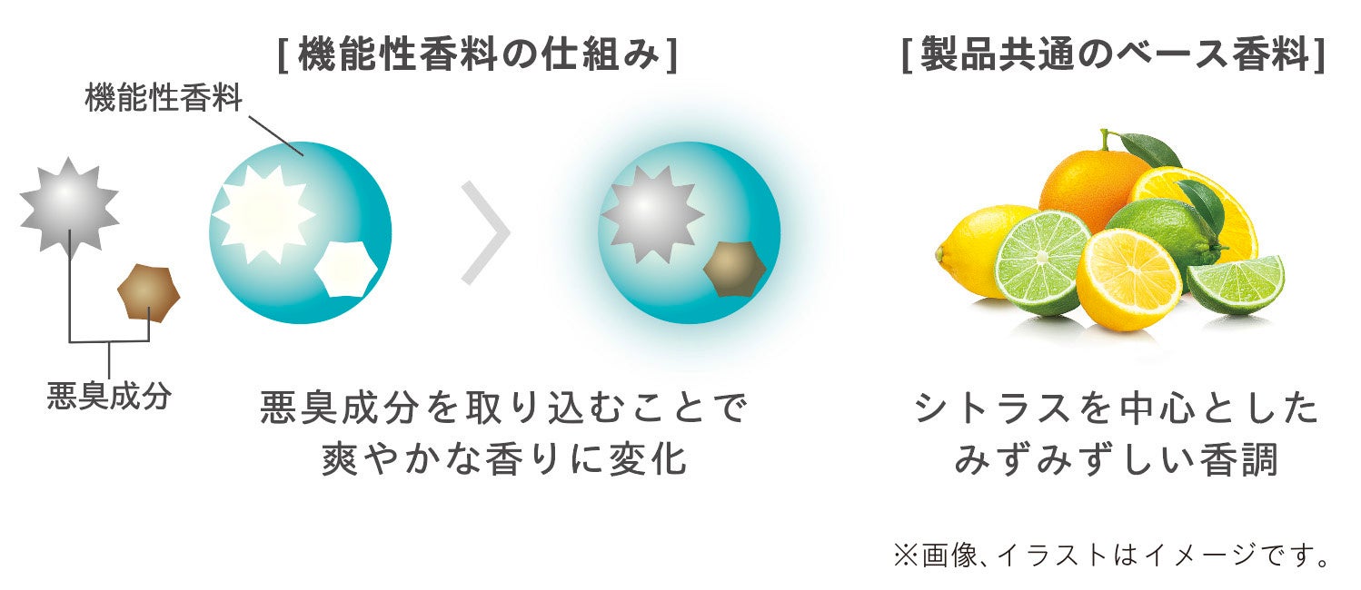 汗や皮脂臭・タバコ臭などの悪臭成分を取り込むことで爽やかな香りに変える機能性香料で、ニオイさっぱり。みずみずしく透明感のあるシトラスをベースに上質なウッディノートが調和した、クリーンで知的な印象の香り。